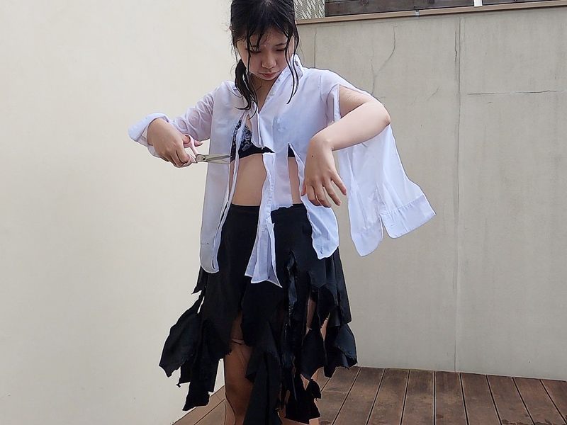 その後、プールサイドで再びハサミを手に取り、今度はブラウスにもハサミを入れて切り裂き&引き裂いていきます。スカートもブラウスもボロボロになった状態をじっくり観察できます。プールシーンでは水中映像とともに一連の流れをお楽しみください。