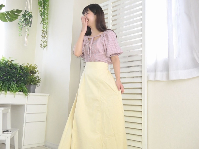 本作は、撮影会の代行撮影を通じて実現した作品です。ロリータフェイスの玉響さんの出演です。長袖のトップスとベージュのロングスカートのコーディネイトで、スカートの形状が面白いデザインスカートとなっています。サイドに2本タック …